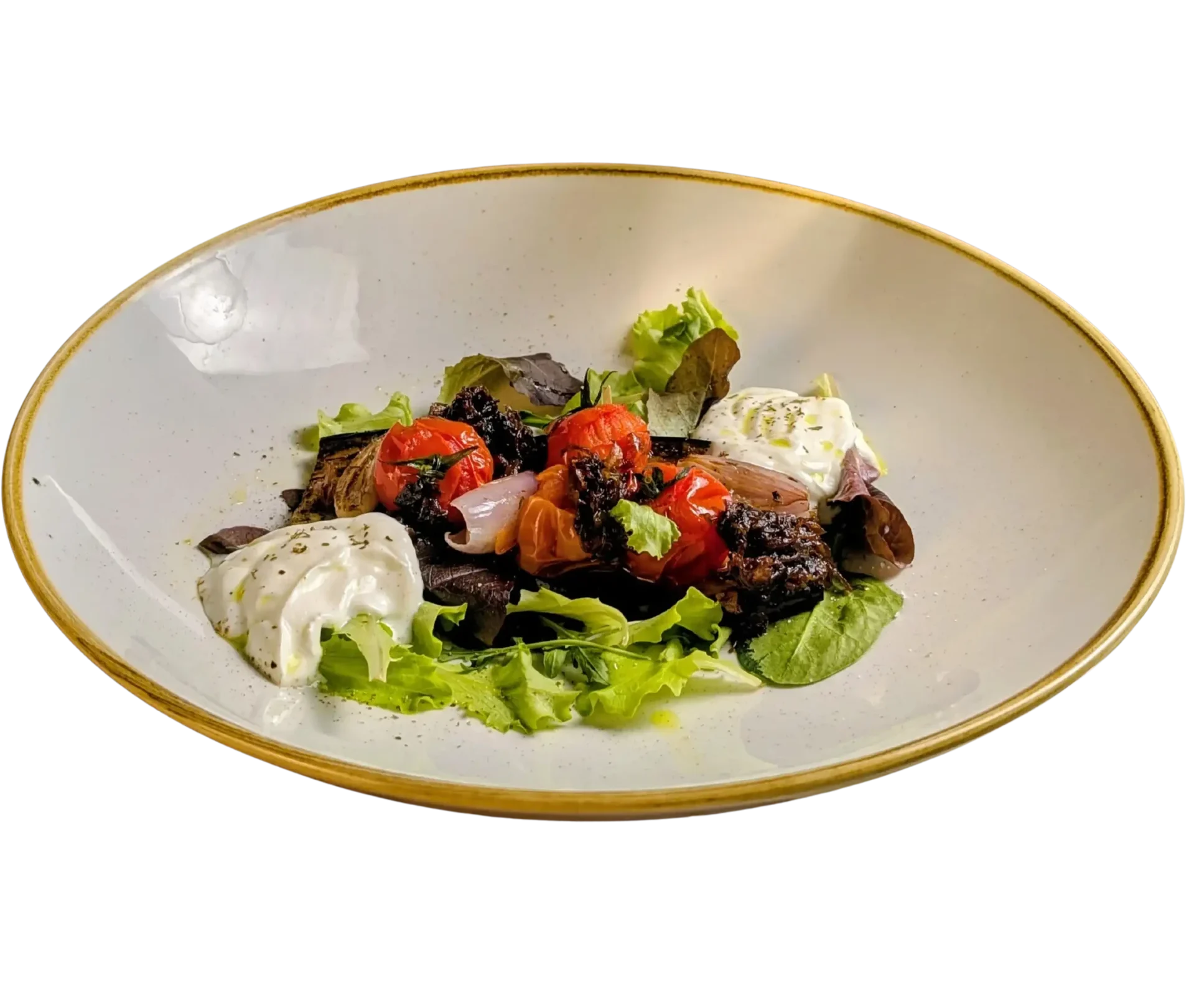 - Ratatouille salad of roasted Mediterranean vegetables with olive oil and fresh herbs.